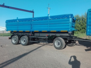 Трехосный прицеп зерновоз самосвал двухскатный 16 тонный с разгрузкой на две или три стороны, для перевозки зерновых культур и не только. Обычно идет в составе автопоезда КАМАЗ зерновоз с прицепом.